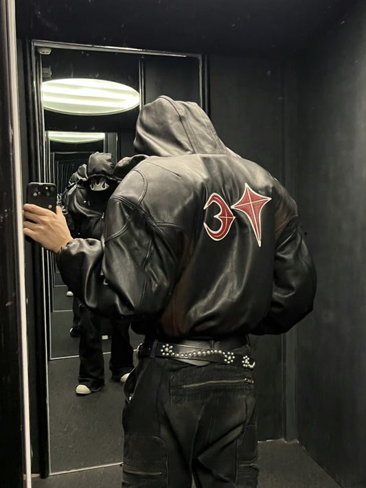 THUG CLUB Heavyweight Black Washed Goatskin Hooded Leather Short Padded Jacket