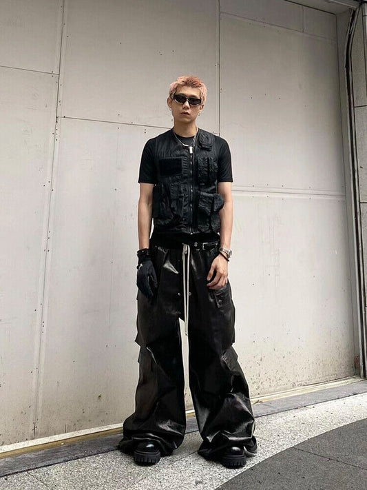 RO Metallic Coated Brushed Wax Glossy Pocket Straight Wide-Leg Flared Trousers