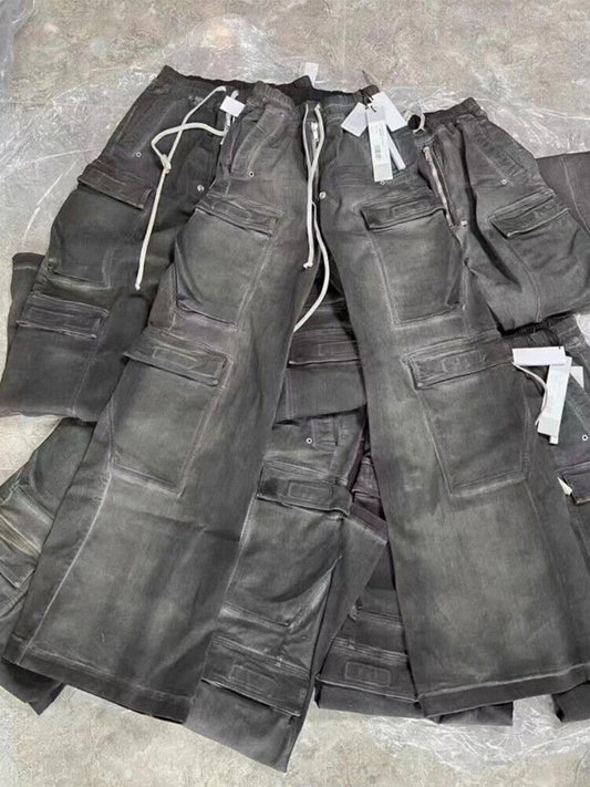 RO Rick Owens Washed Ash Gray Gradient Pocket Workwear Straight Wide Drawstring Jeans