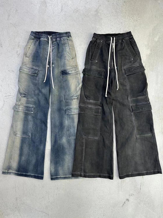 Self-made 23SS Rick Owen Wide-Leg Washed Gray Jeans Ash Gray Unisex Cargo Pants