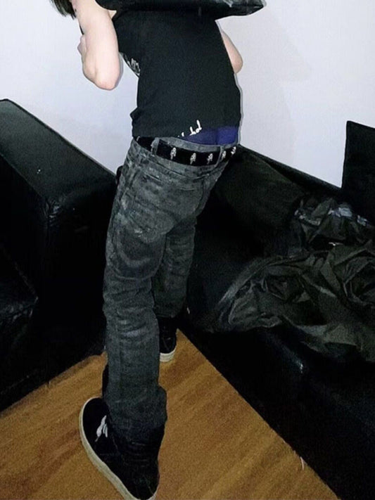 Self-made Rick Owen ACBT Dark Waxed Black Denim Pants – High Stretch Flared Wide-Leg Trousers