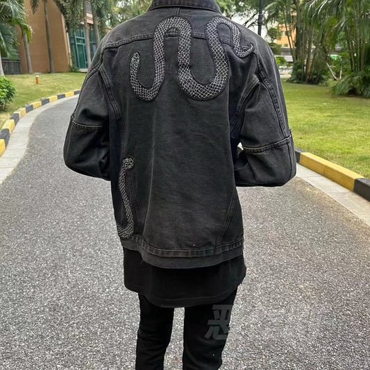 Self-made AMIRI Black Snake Embroidered Denim Jacket - Washed High-Street