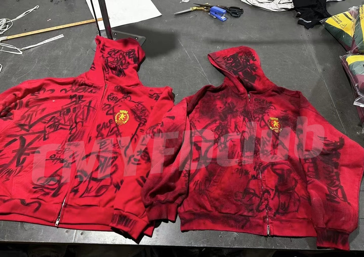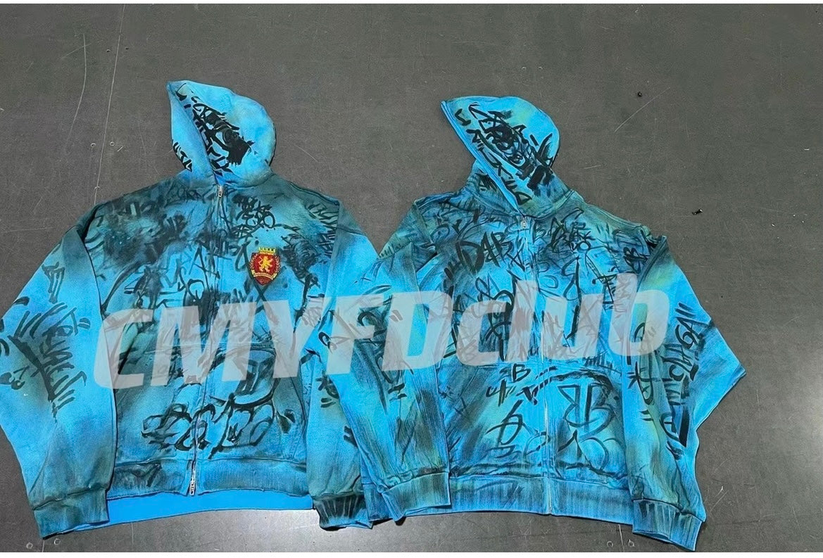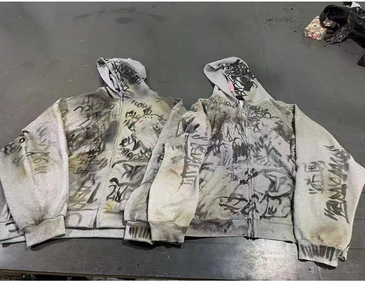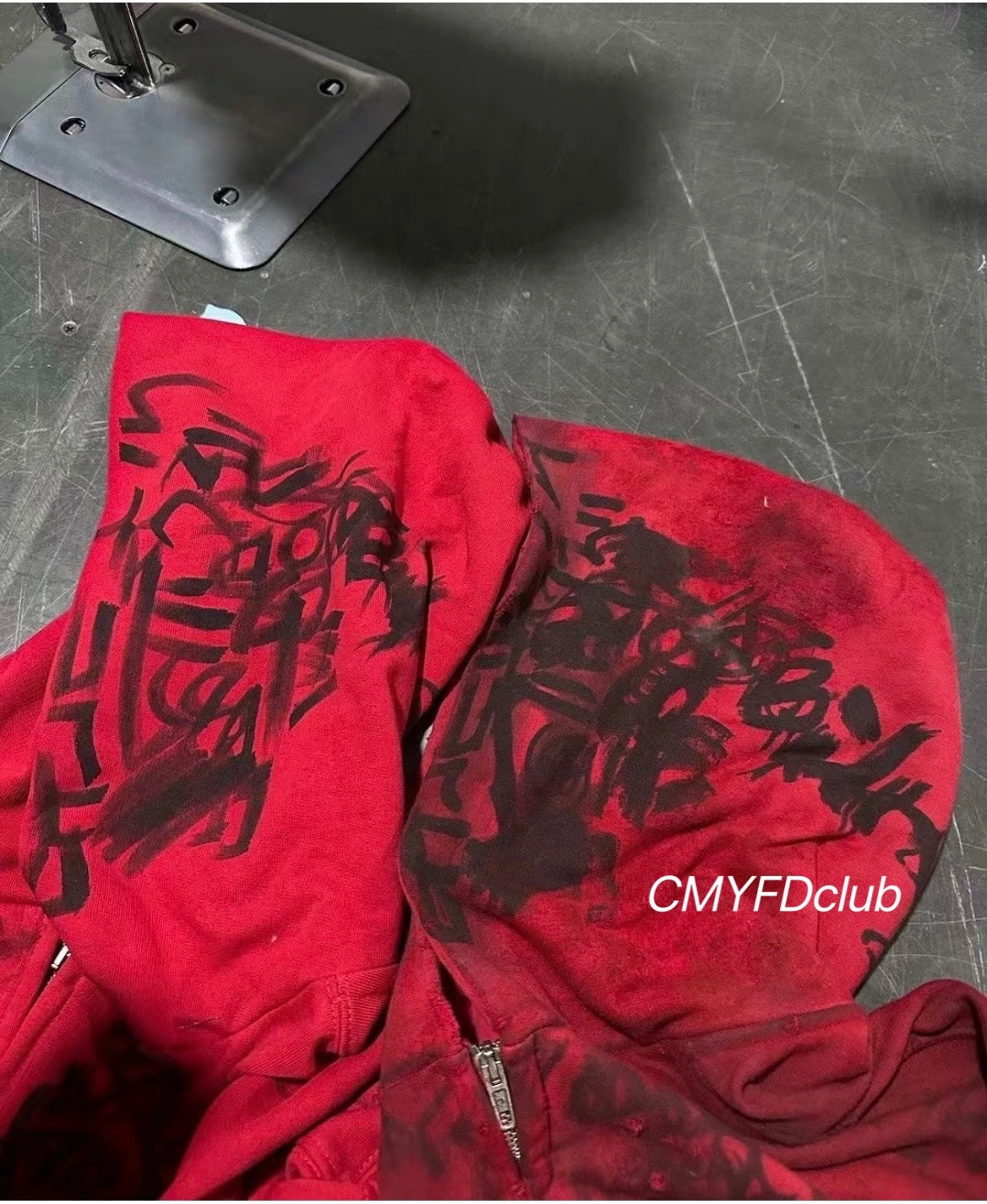 23SS Runway Manchester United Sater Hand-Painted Graffiti Distressed Muddy Zip-Up Hoodie