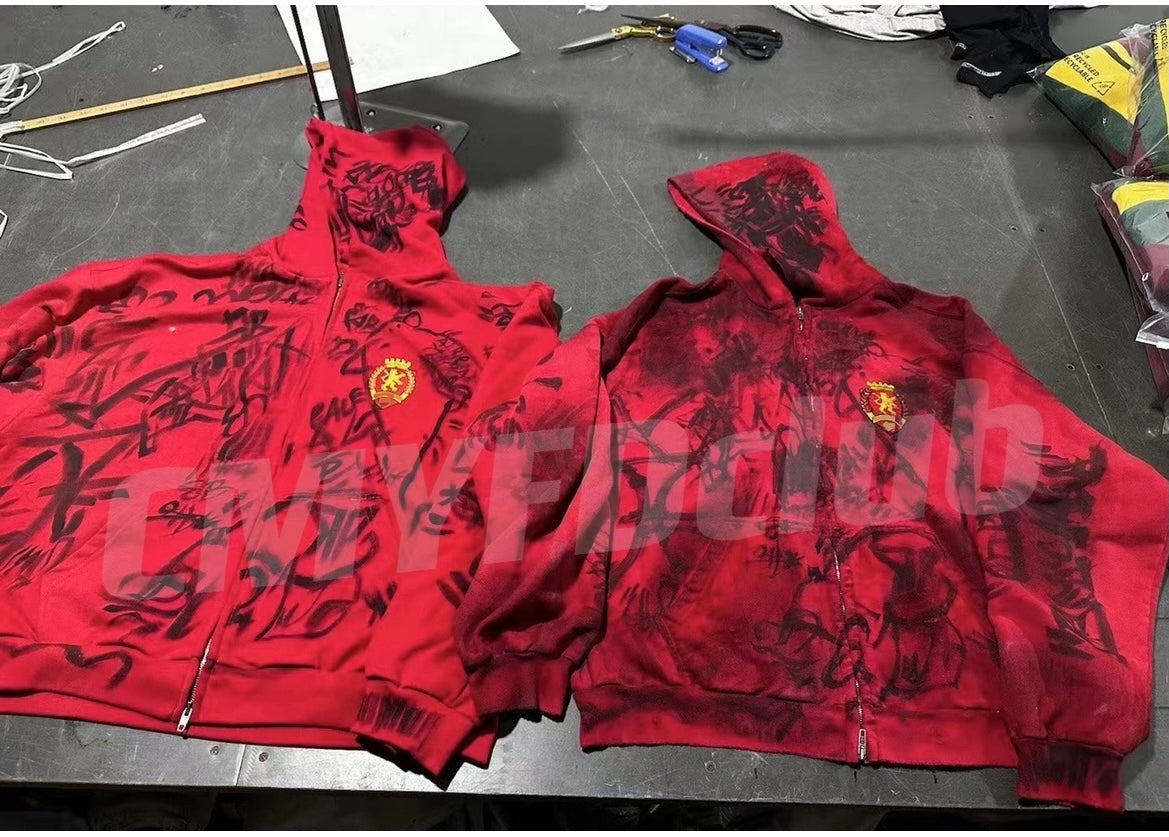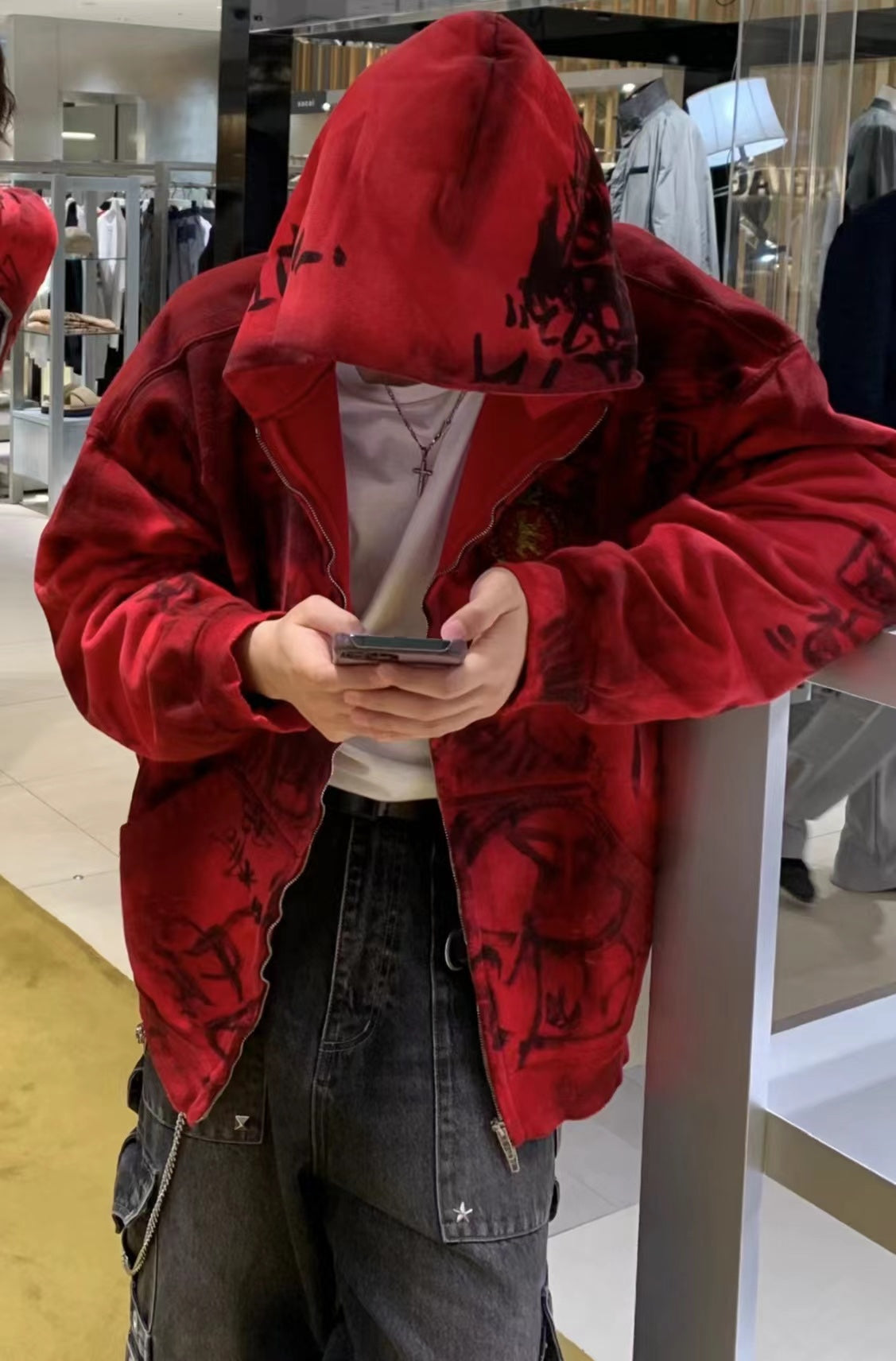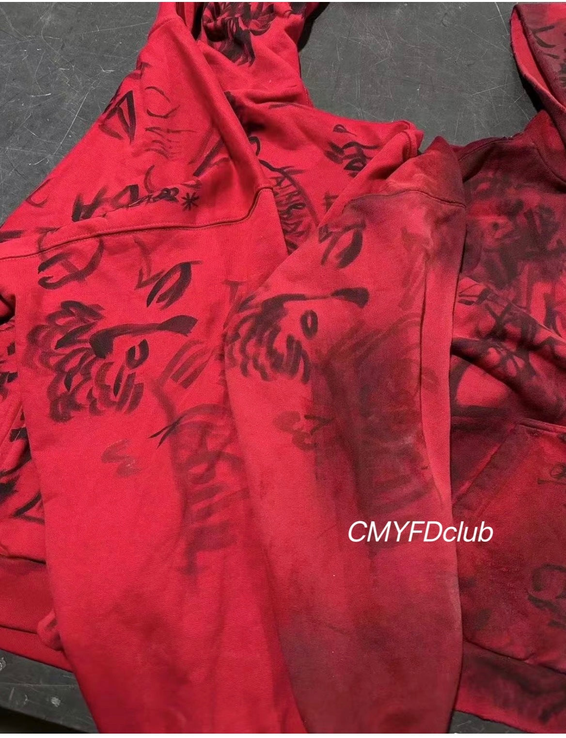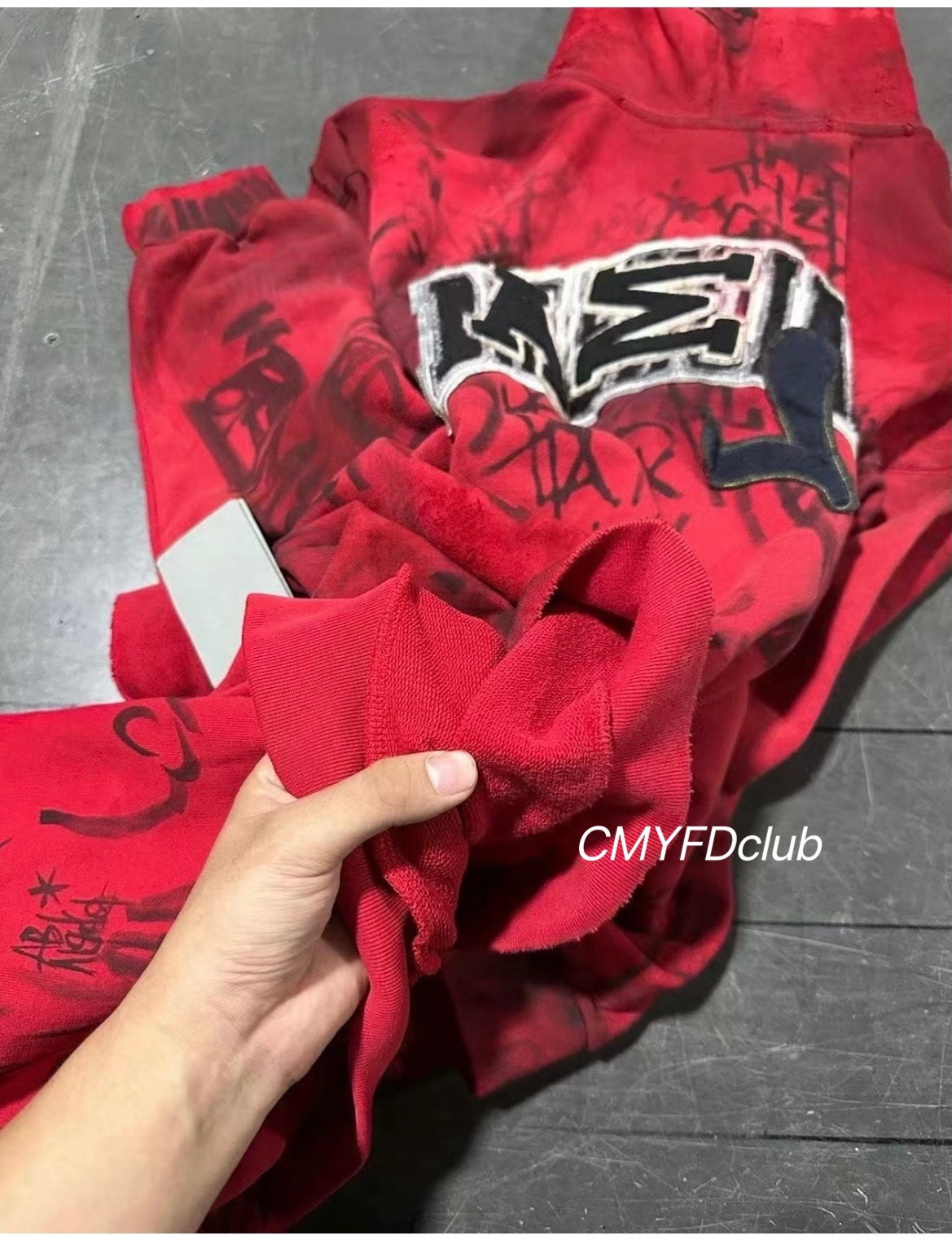 23SS Runway Manchester United Sater Hand-Painted Graffiti Distressed Muddy Zip-Up Hoodie