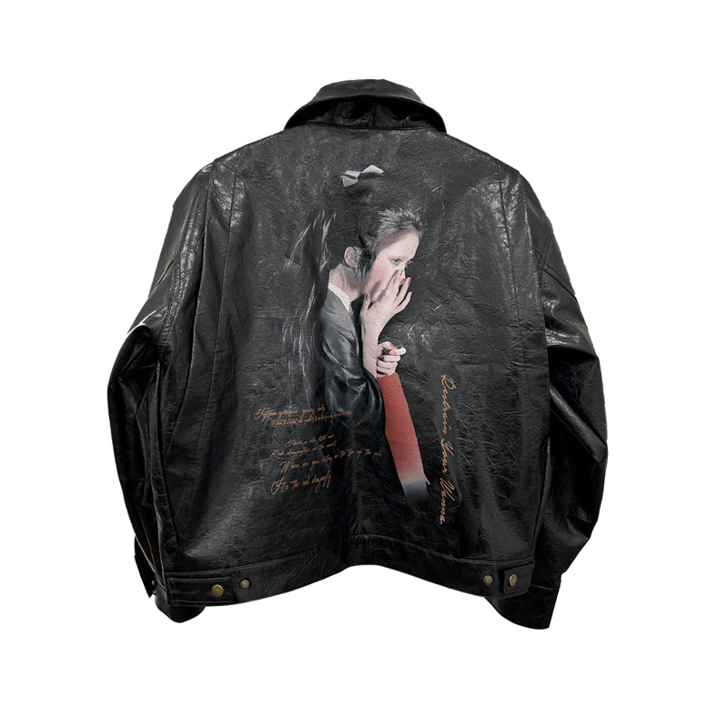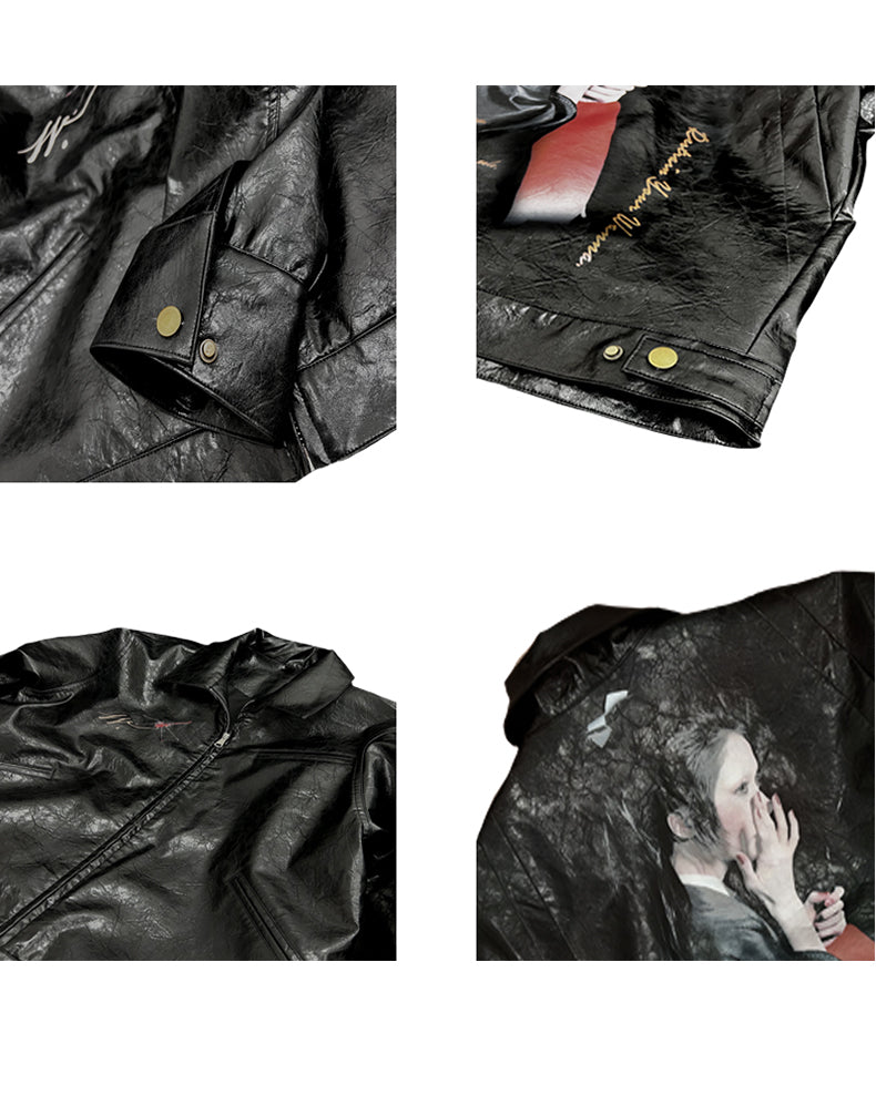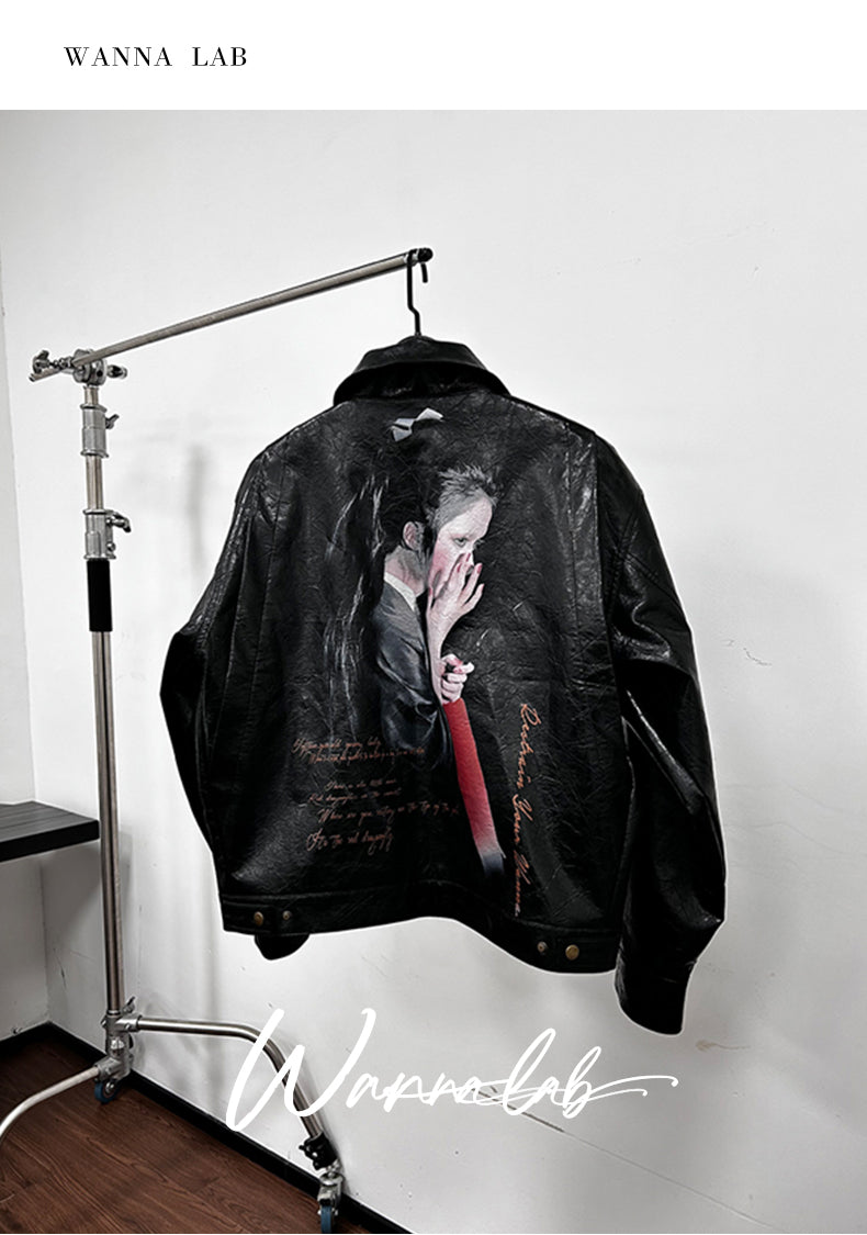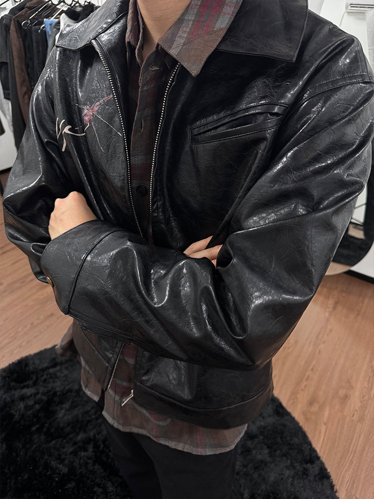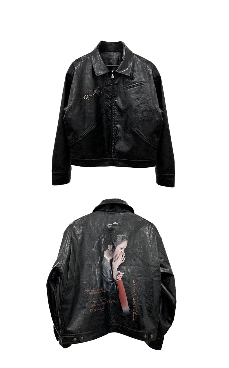 25SS Yohji Dark Vibe Dragonfly & Woman Ink Print Wrinkled Waxed Leather Jacket