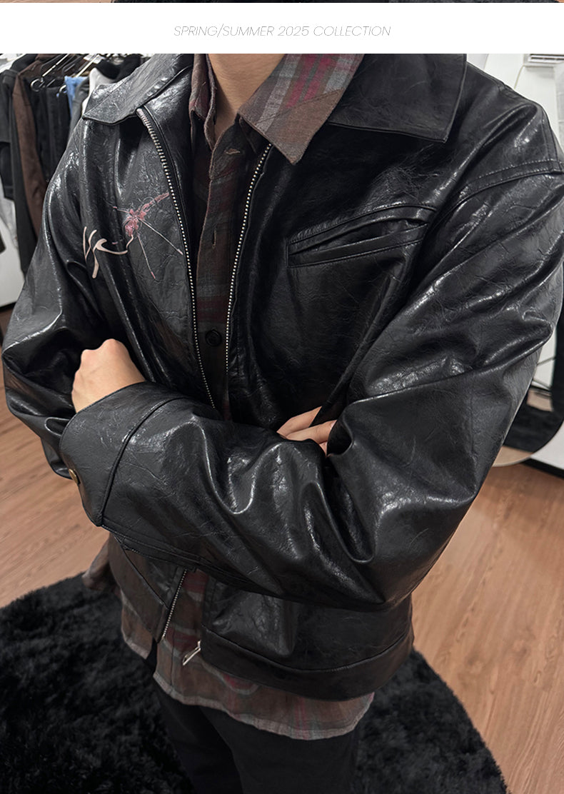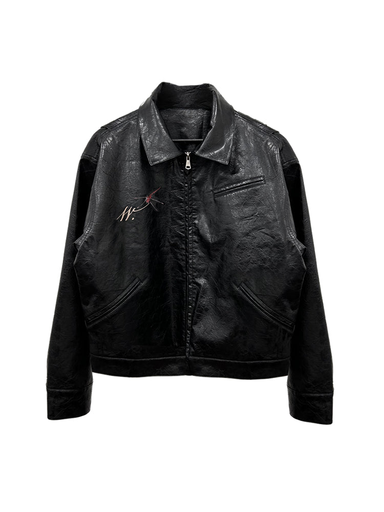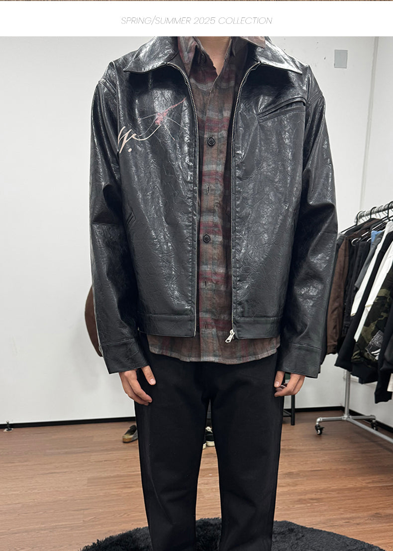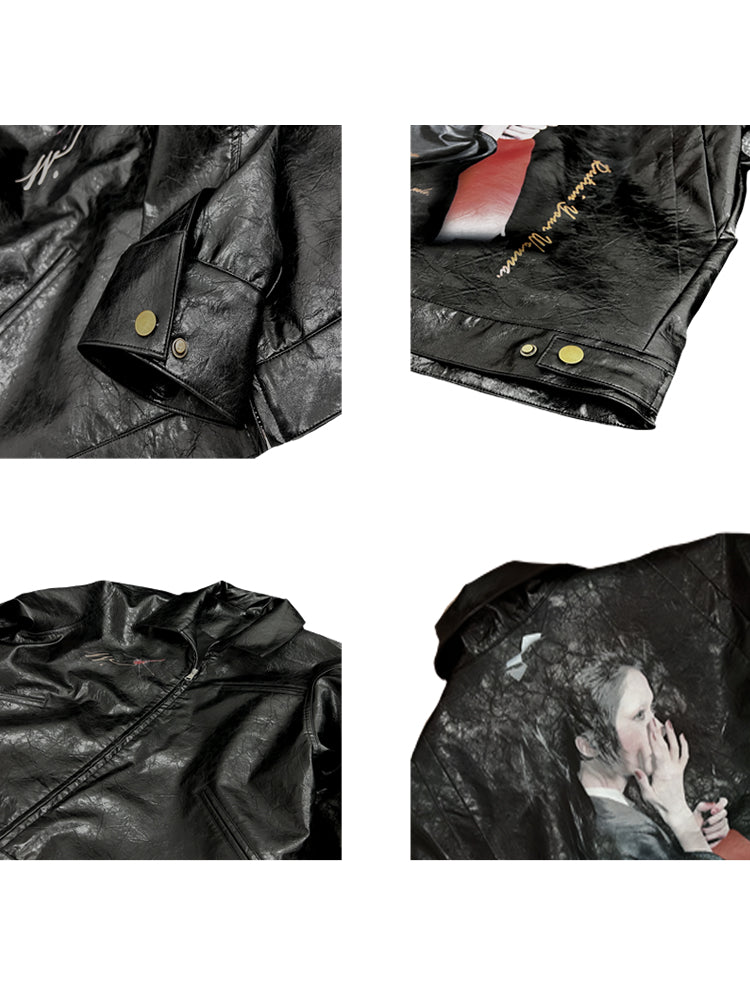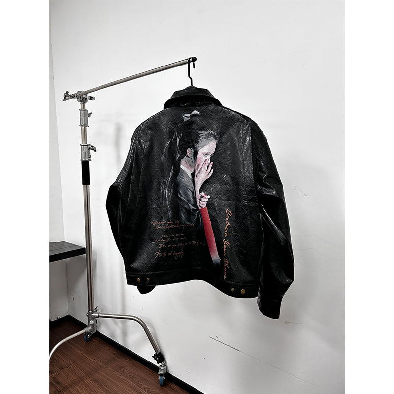 25SS Yohji Dark Vibe Dragonfly & Woman Ink Print Wrinkled Waxed Leather Jacket