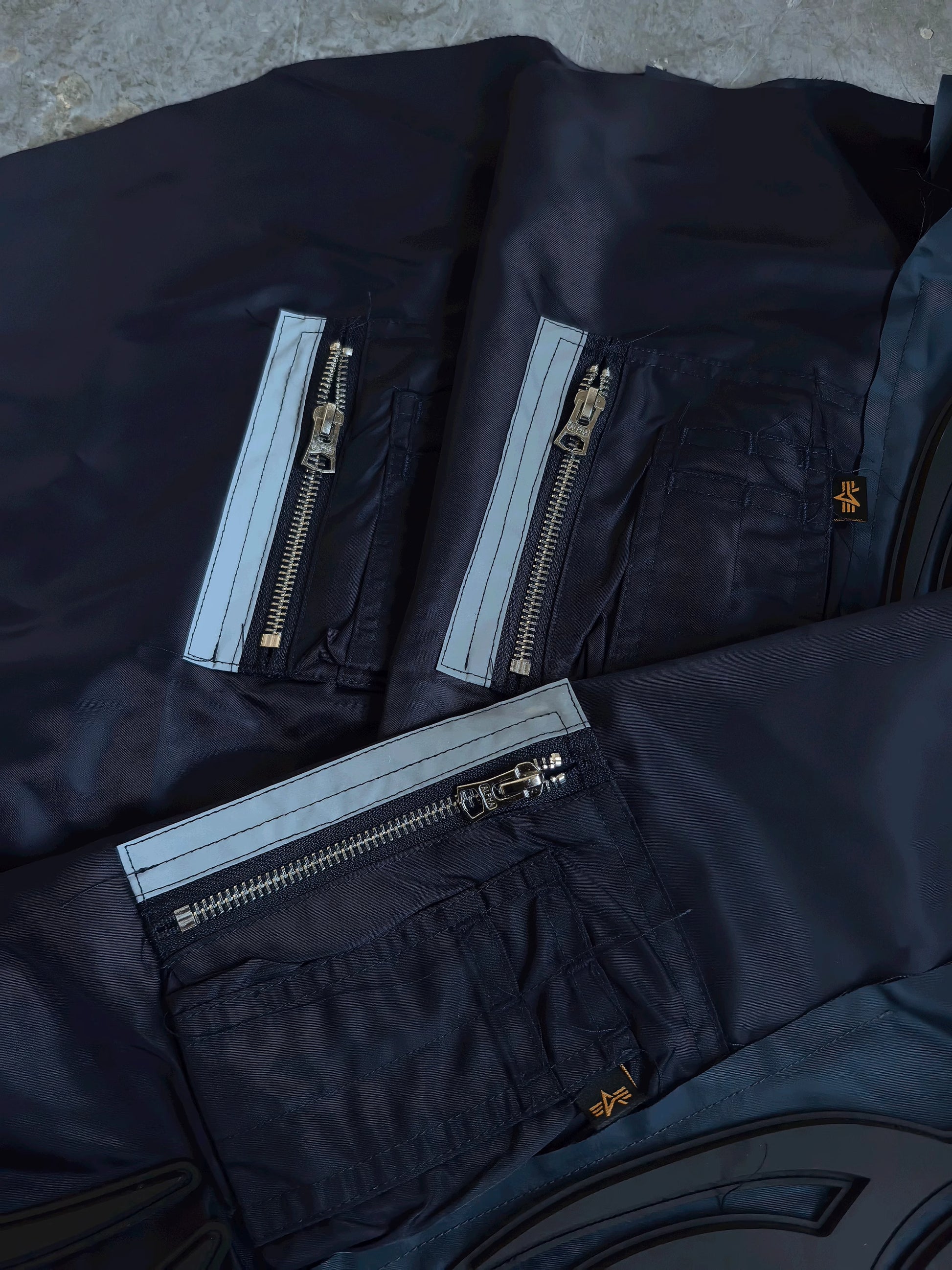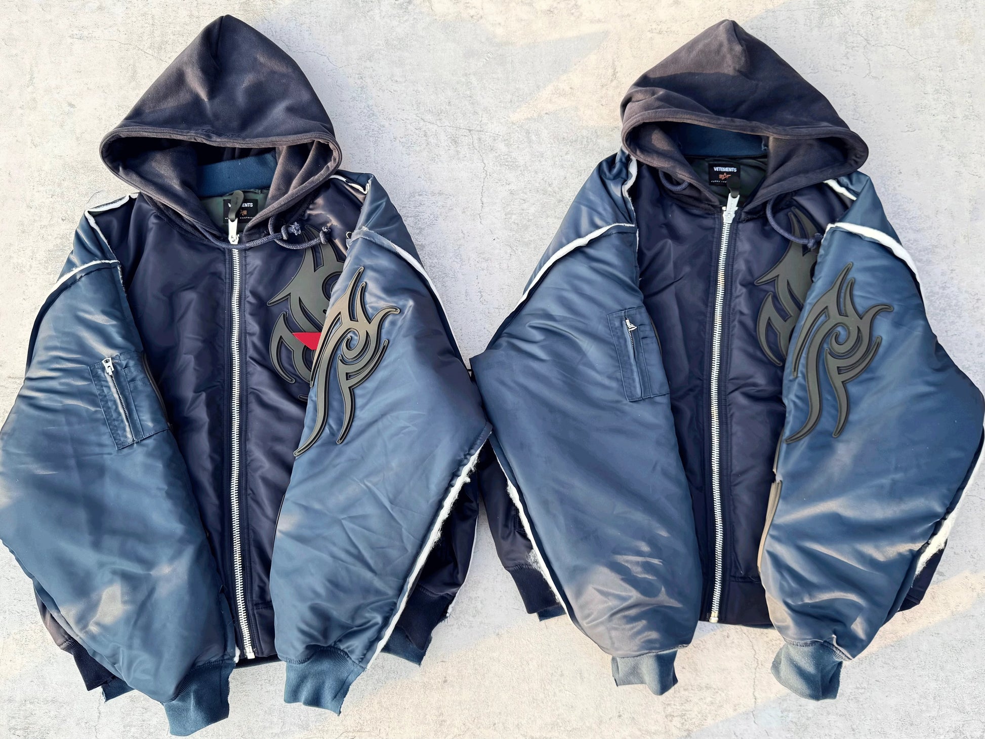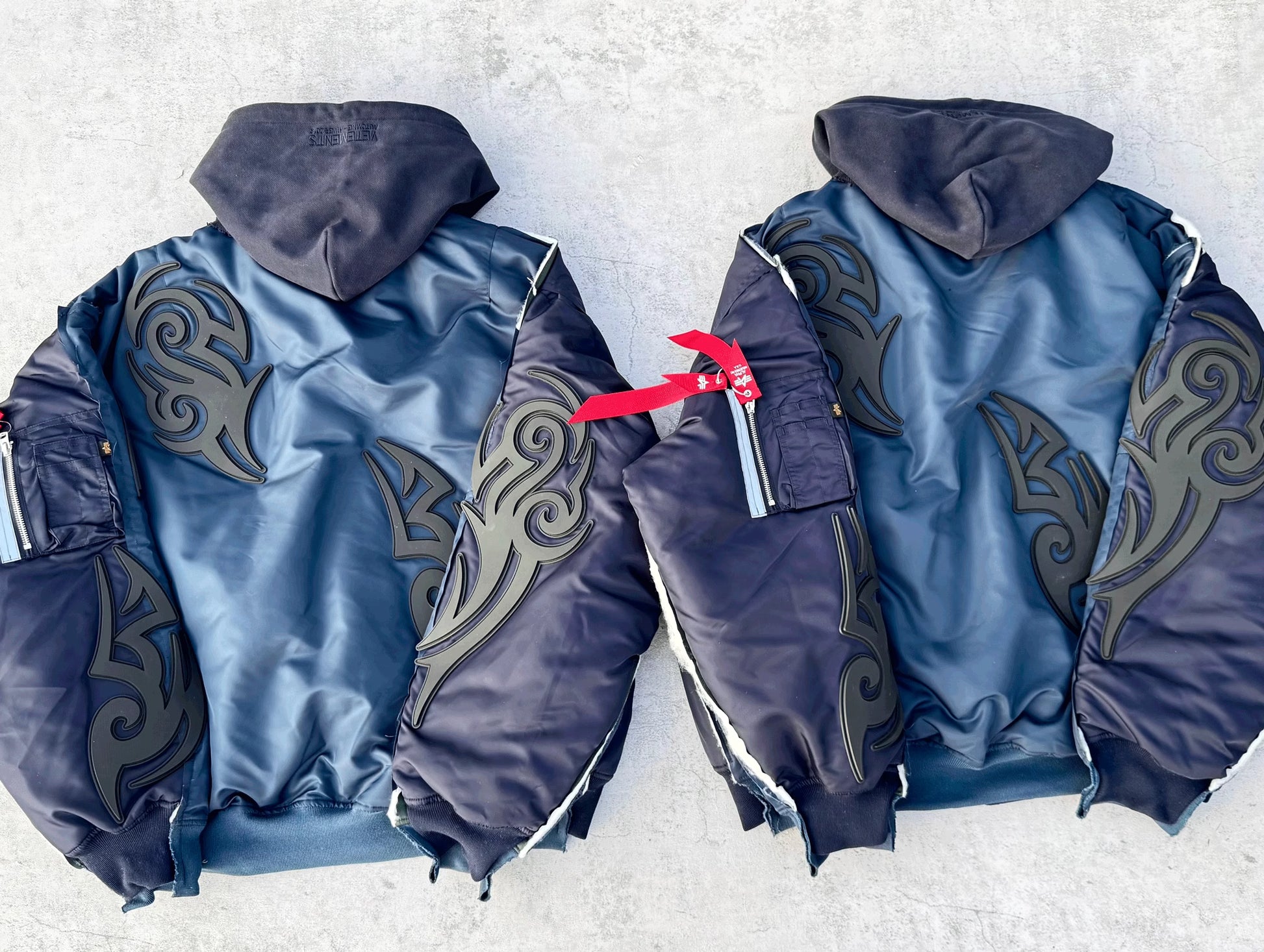 This custom-made 19AW Alpha Industries Vetements Tribal Bomber Blue Padded Jacket is crafted with precision and style, featuring a unique tribal pattern and padded material for ultimate comfort and warmth. Perfect for any fashion-forward individual looking to make a statement and stay cozy in colder weather.