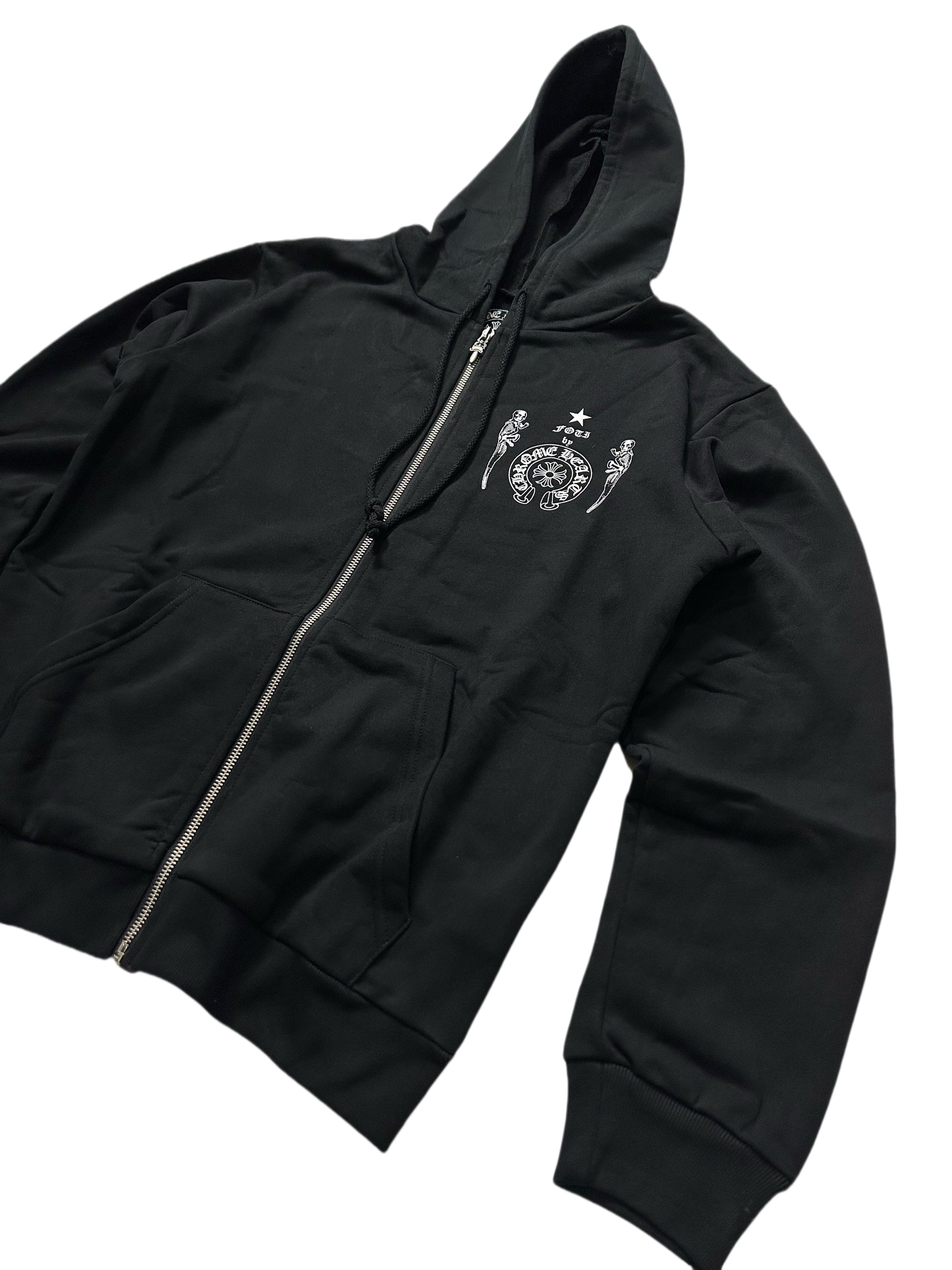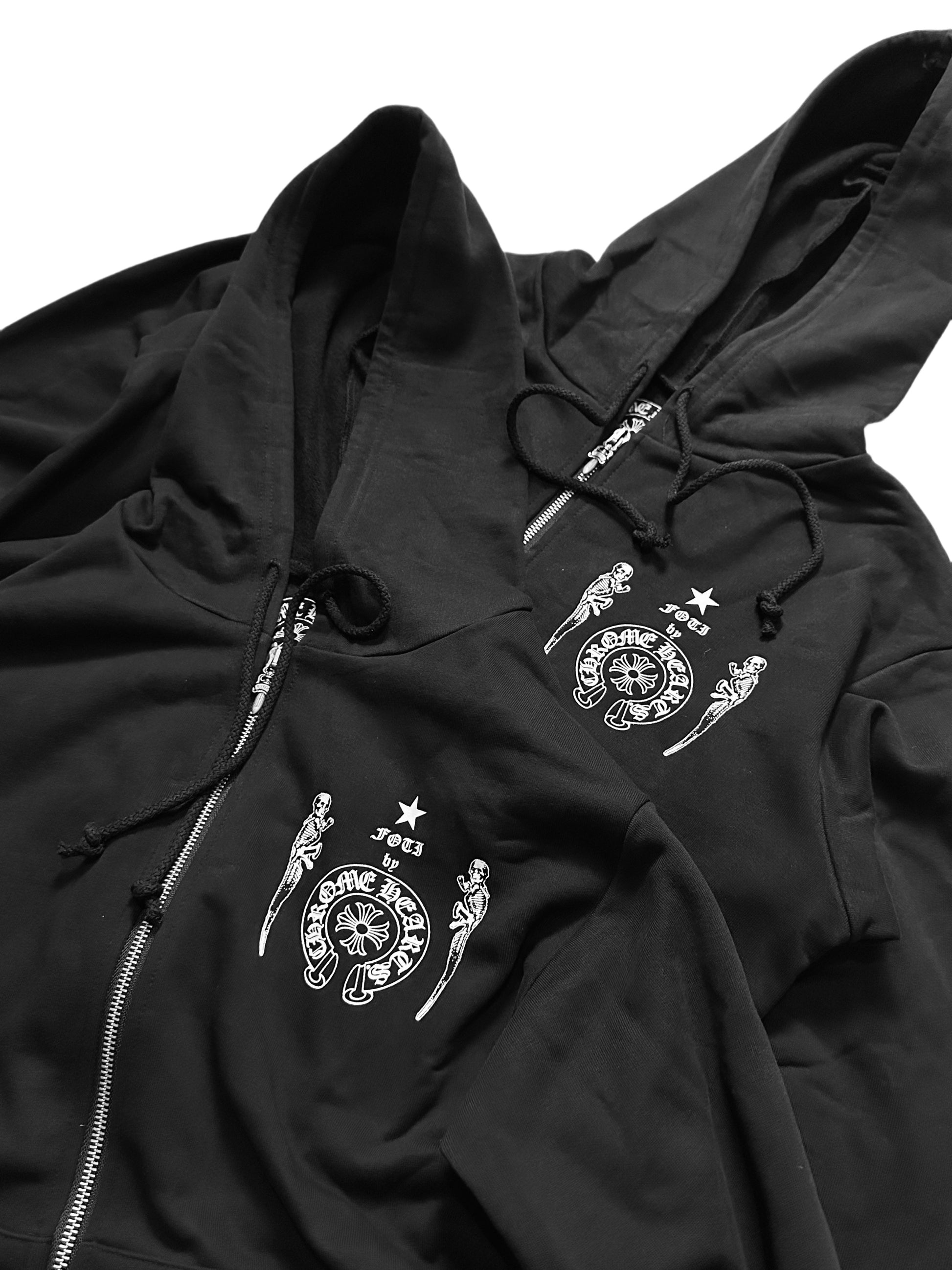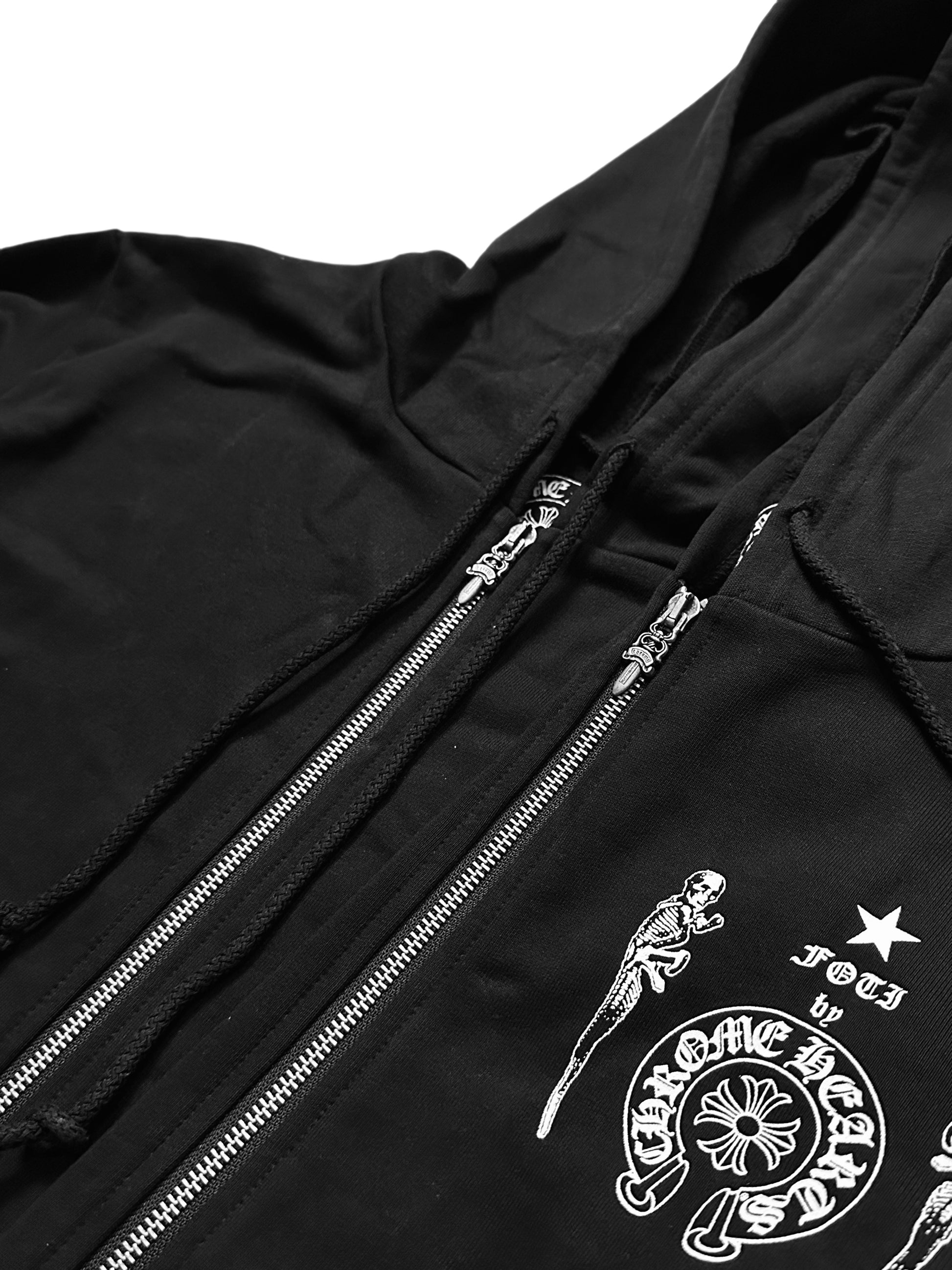 Expertly crafted with a custom Foti Skeleton Chrome Hearts print, this boxy fit hoodie offers both style and functionality. The short plush fabric provides comfortable warmth, while the zip-up design adds convenience. Perfect for chilly days, this jacket is an essential addition to any wardrobe.