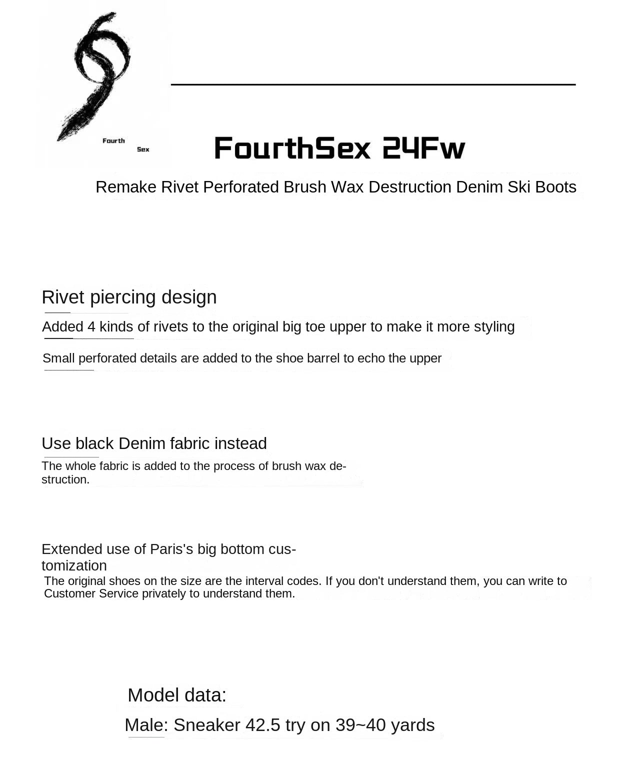Expertly crafted for fashion and function, the Remake 24FW Custom Waxed Distressed Perforated Denim Snow Boots are designed for durability and style. The studded toe adds a touch of edge, while the waxed and distressed denim provides a unique texture. Stay warm and stylish in any weather with these custom snow boots.