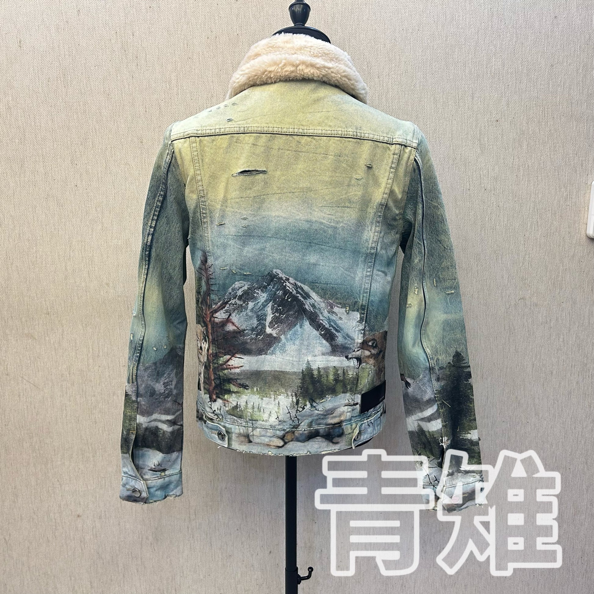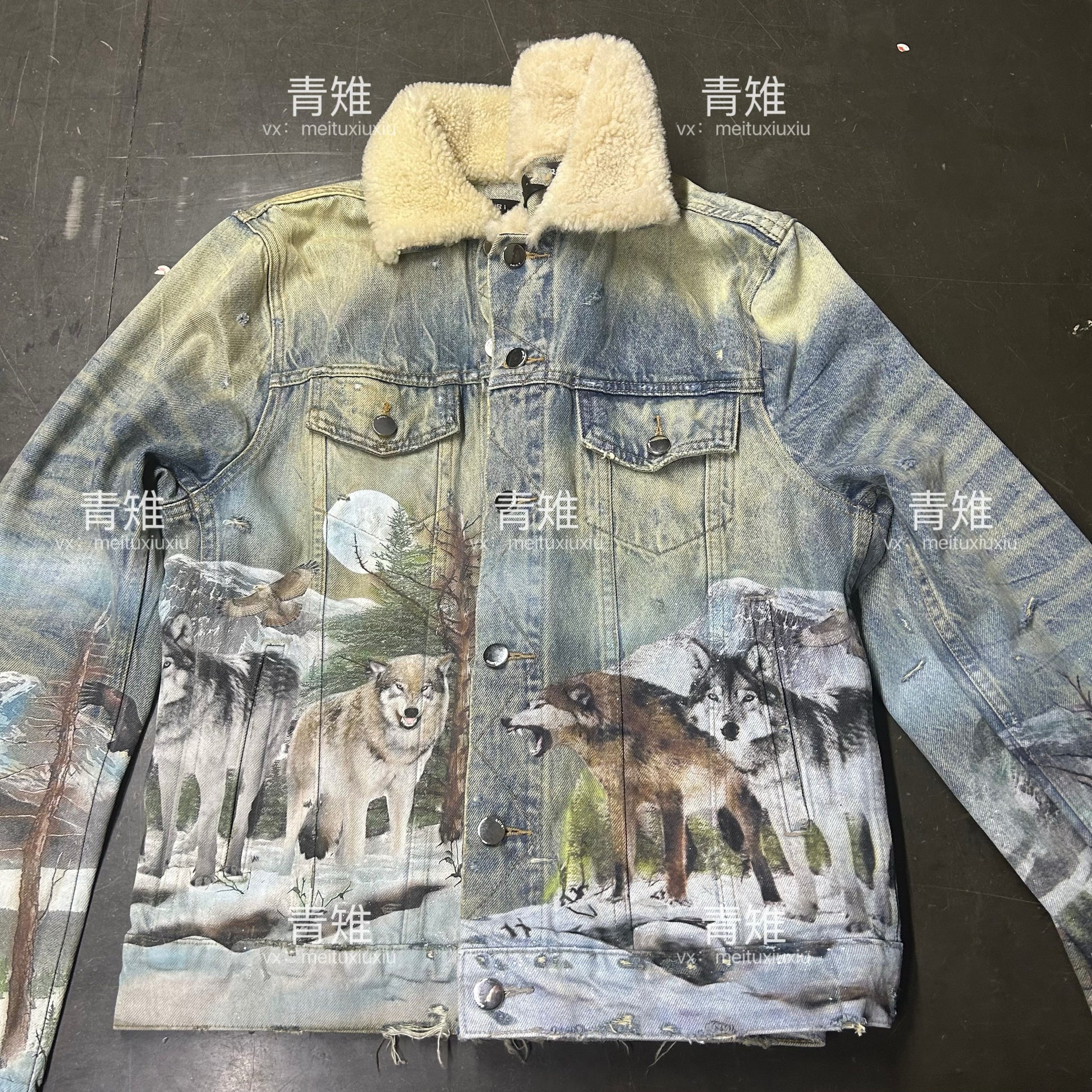 Self-made AMIRI 18AW Snow Wolf Graffiti Jacket - Shearling Collar Waxed High-Street