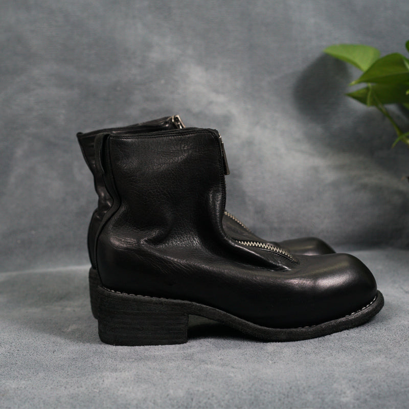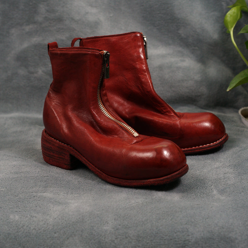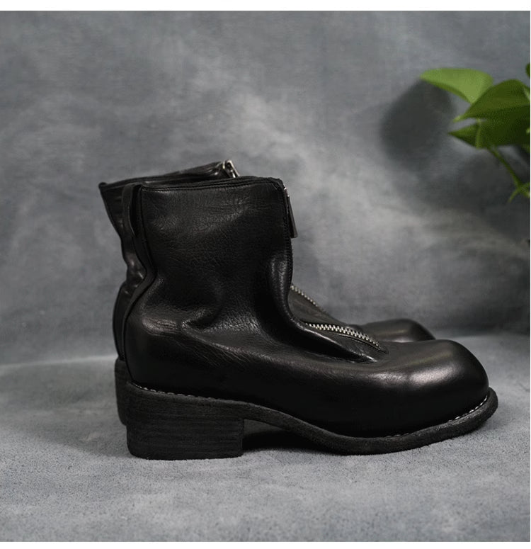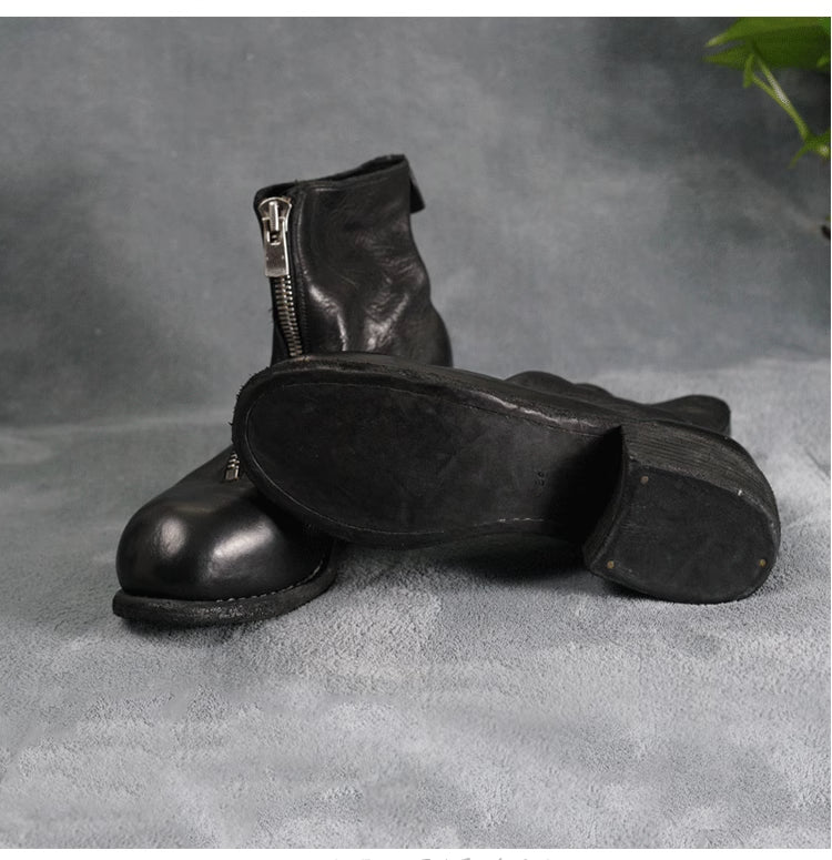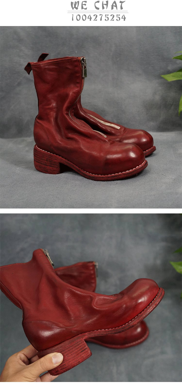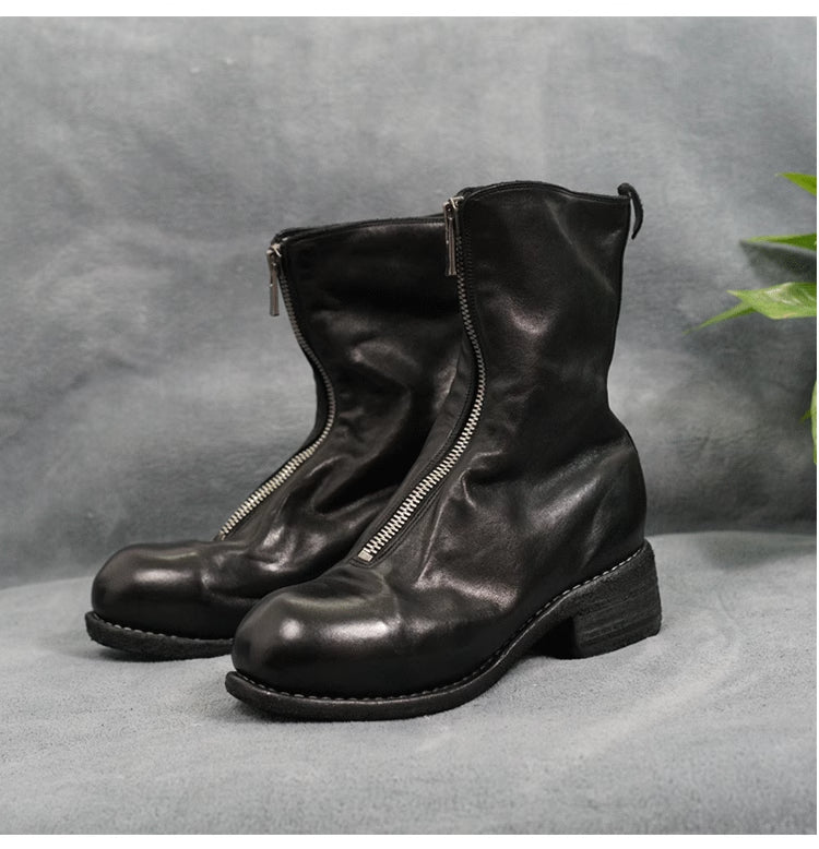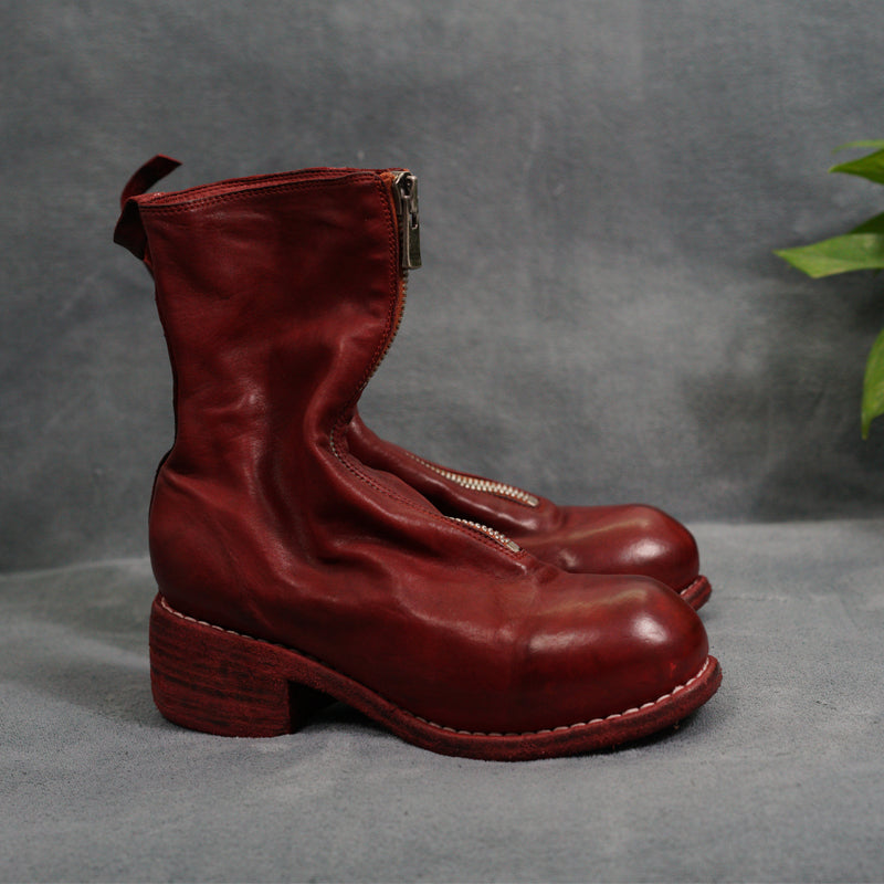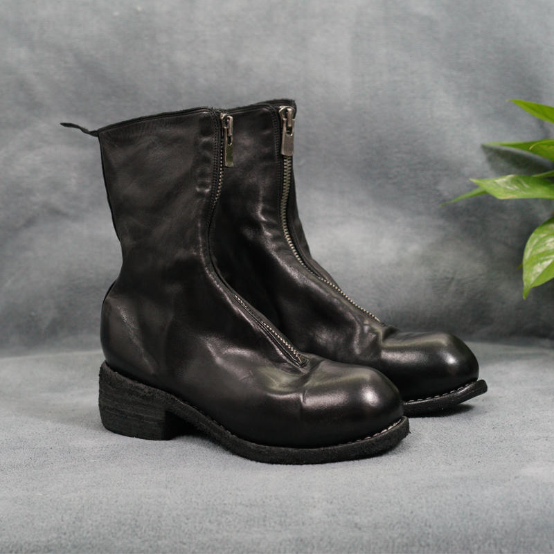 Self-made Guidi Horse Leather Distressed Chunky Heel Mid-Calf Ankle Boots PL1/2 Front-Zip