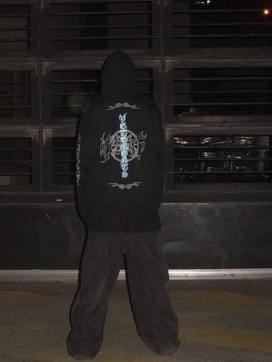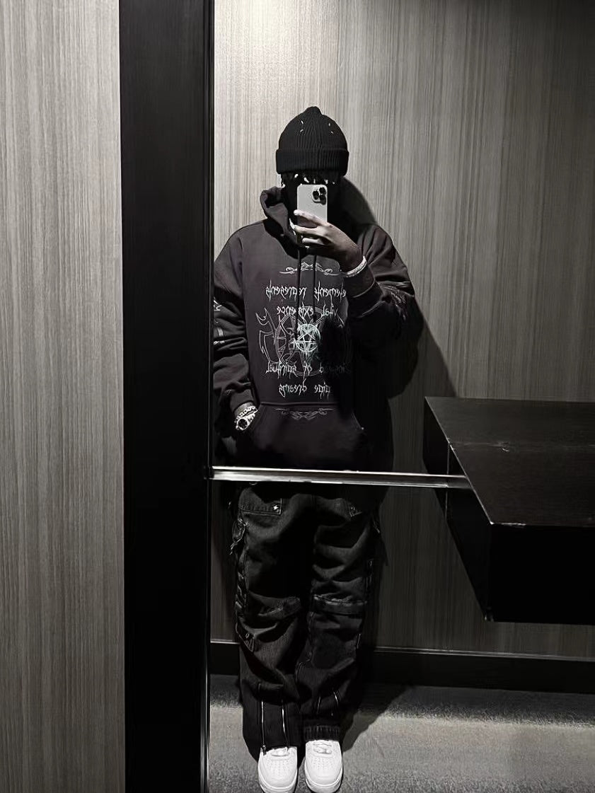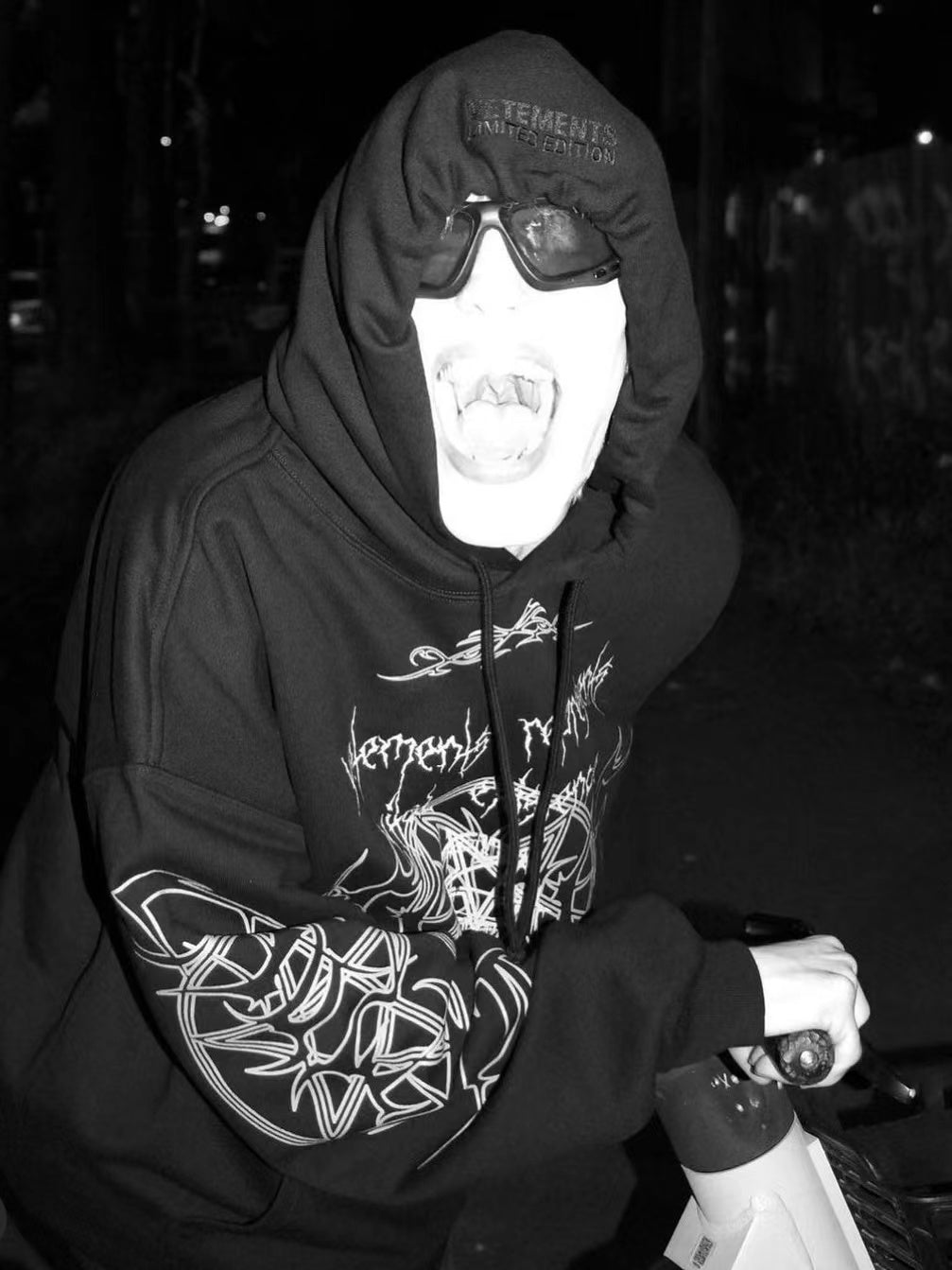 Expertly crafted by Vetements, the VTM 22SS Gothic Rage Hoodie features a striking pentagram design and intricate Sanskrit embroidery. Made for those with a taste for bold and edgy fashion choices, this hoodie is perfect for making a statement. Stay comfortable and stylish with this unique self-made piece.