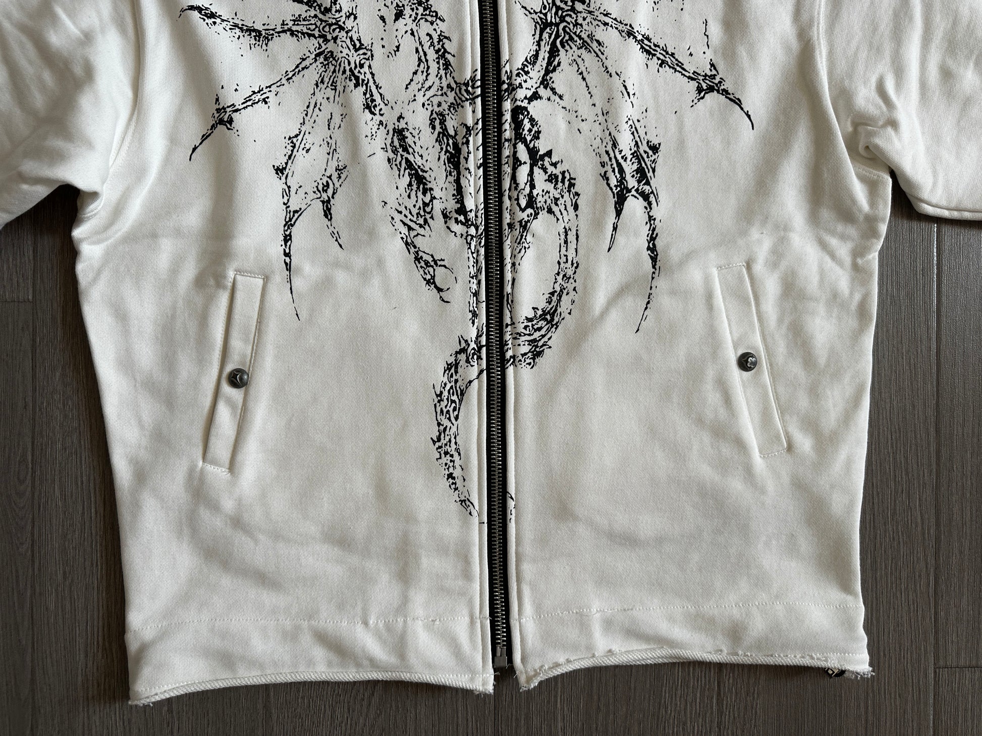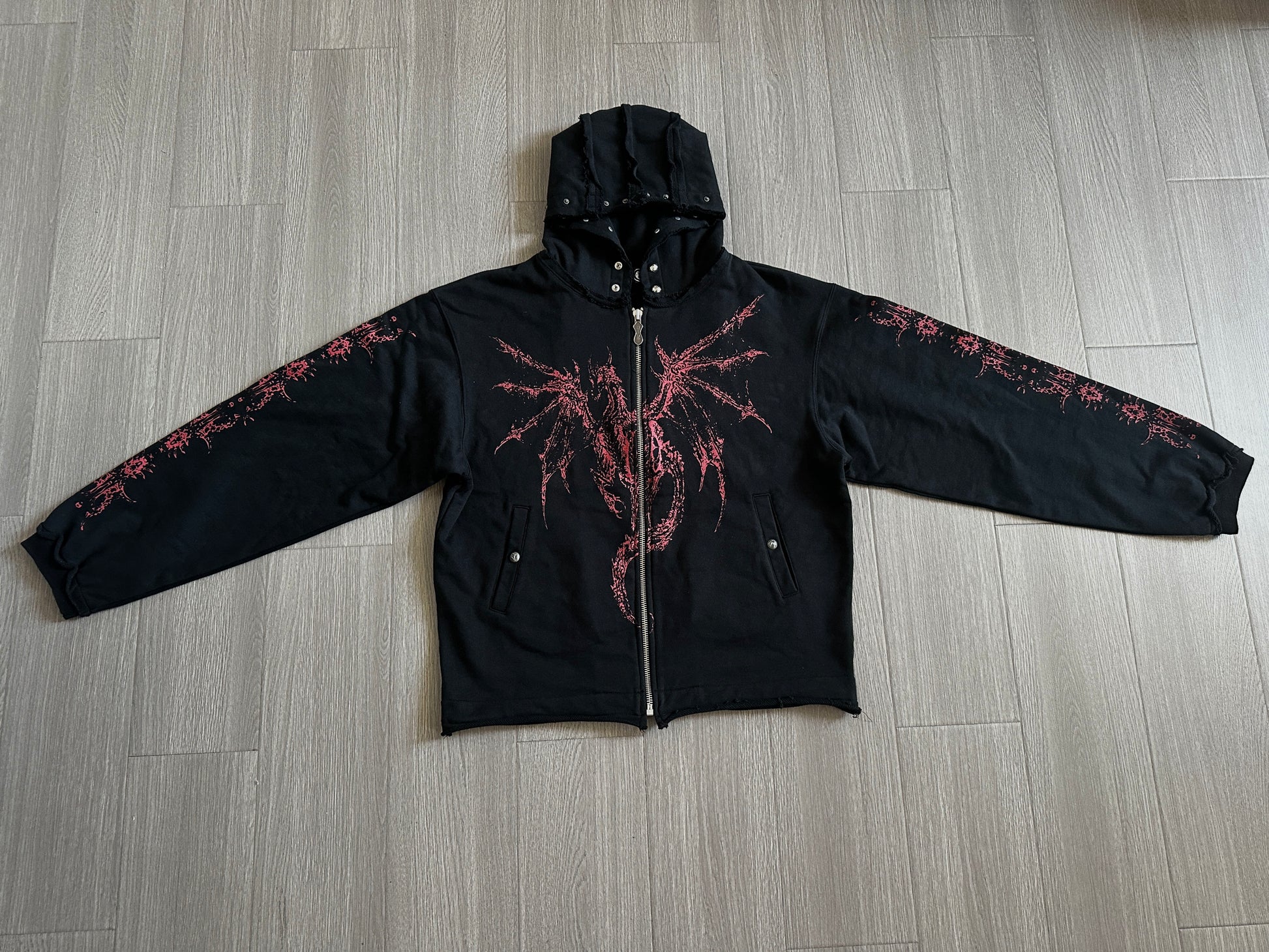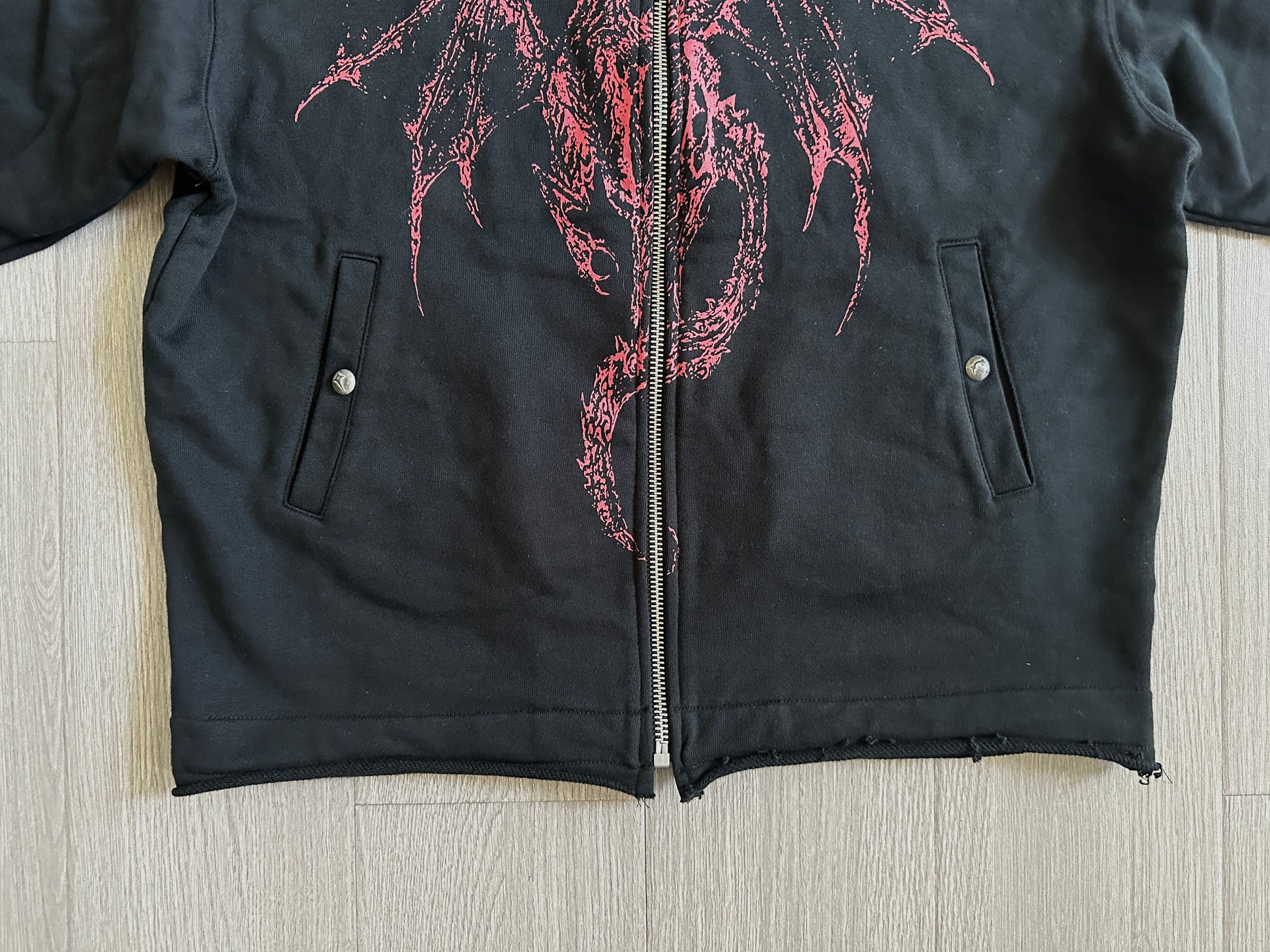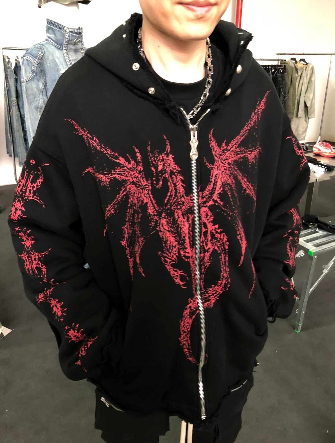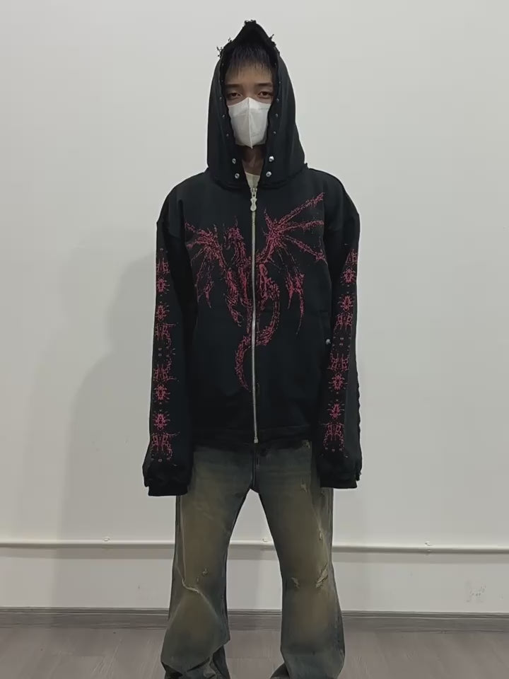THUG CLUB Heavyweight Hoodie Dragon Spine Demon Print Studded Washed Zip-Up Jackets