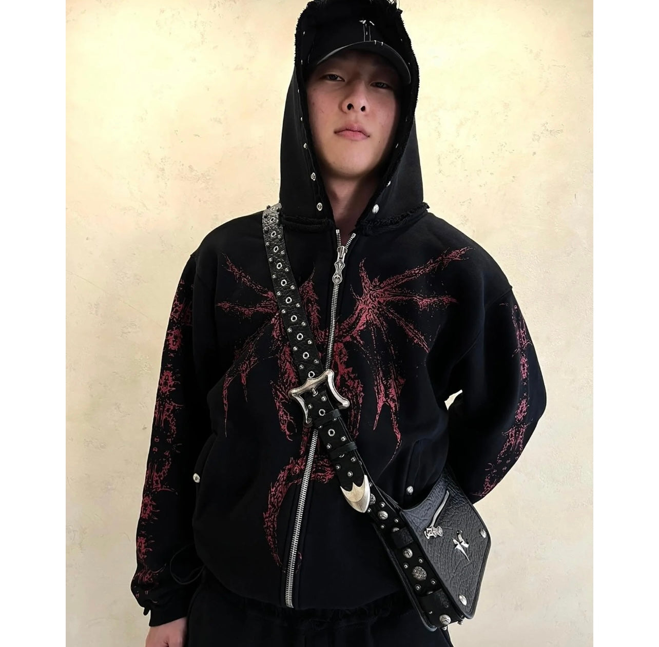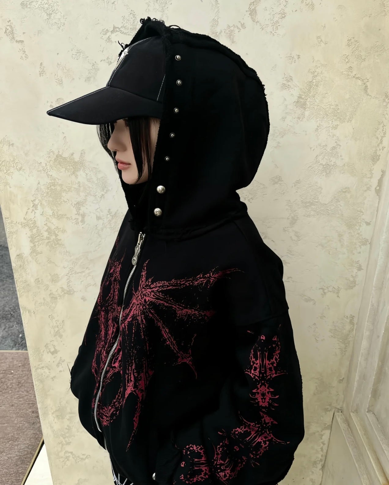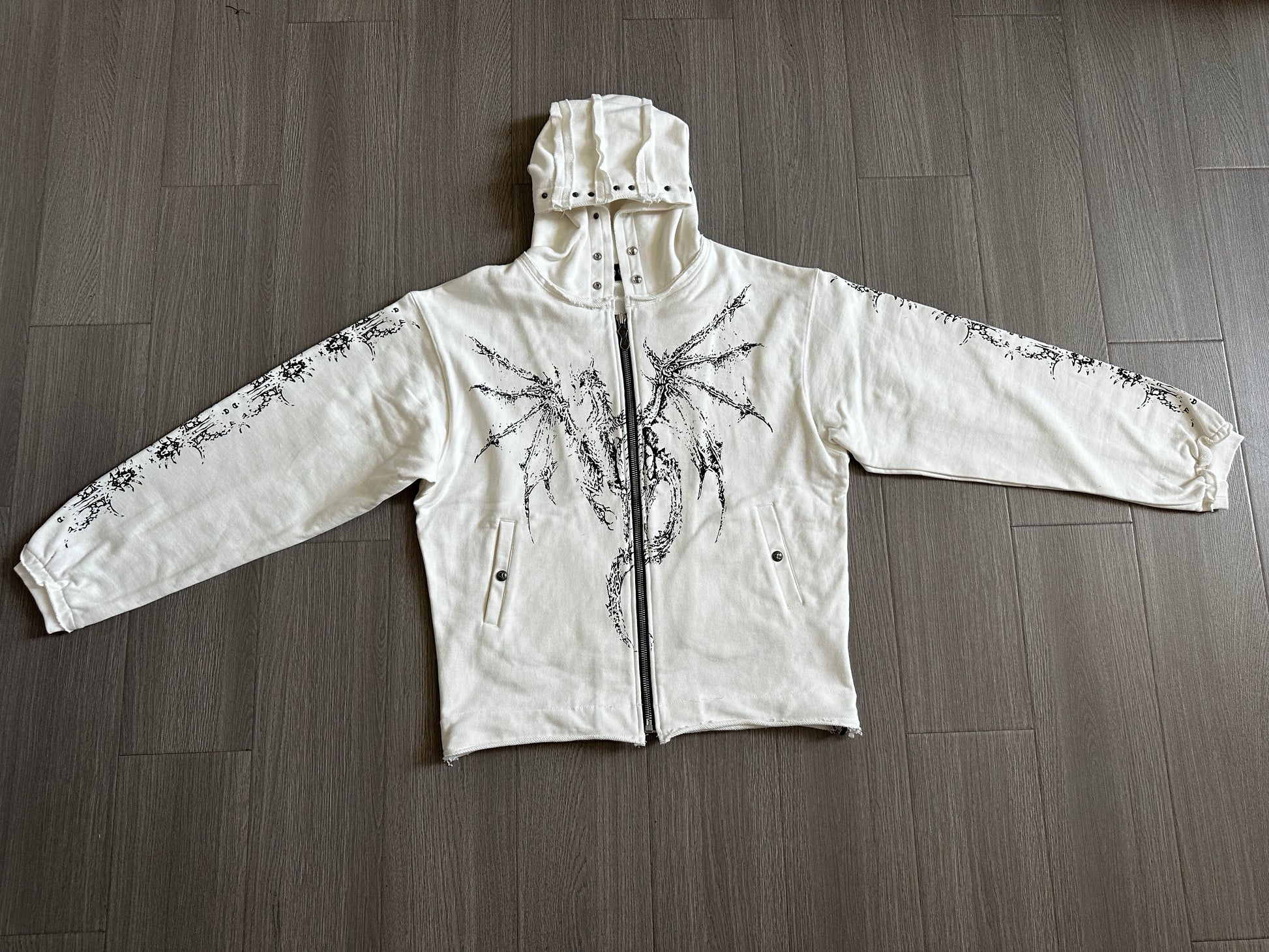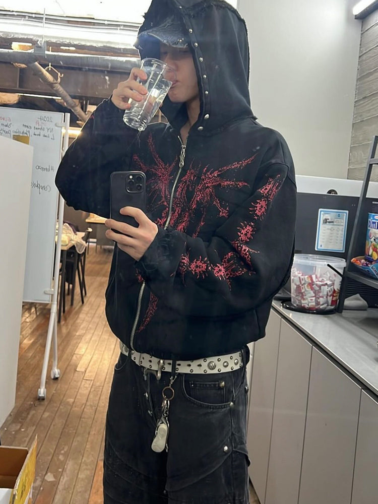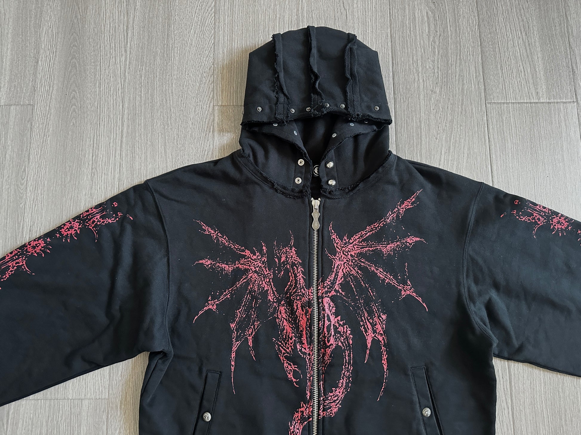 THUG CLUB Heavyweight Hoodie Dragon Spine Demon Print Studded Washed Zip-Up Jackets