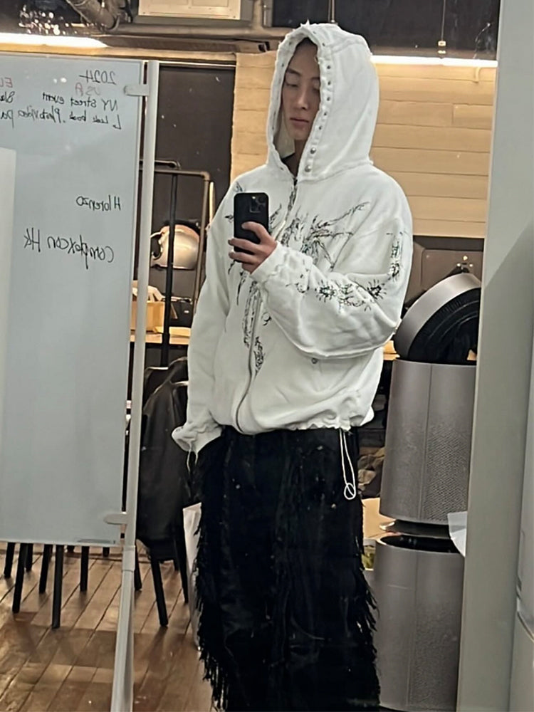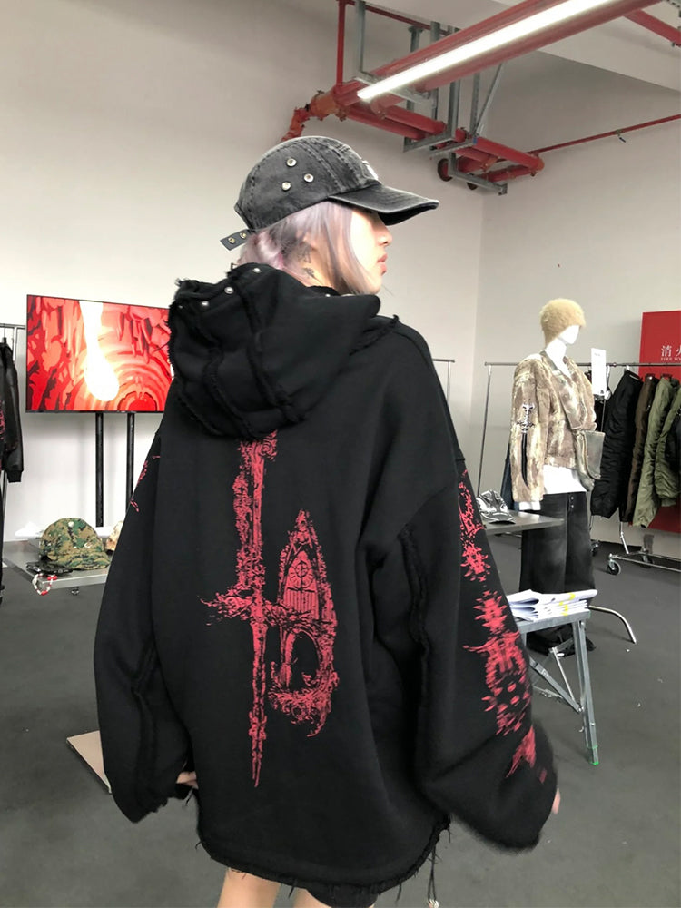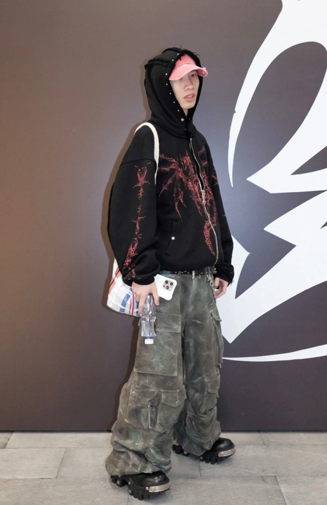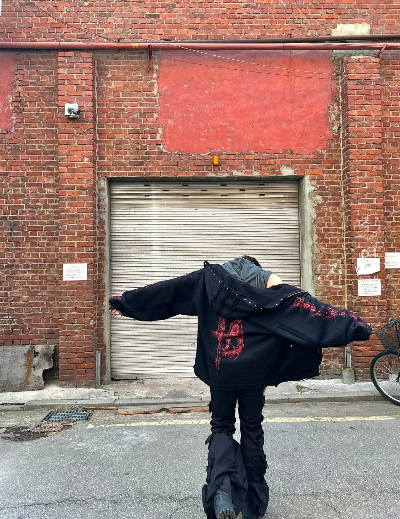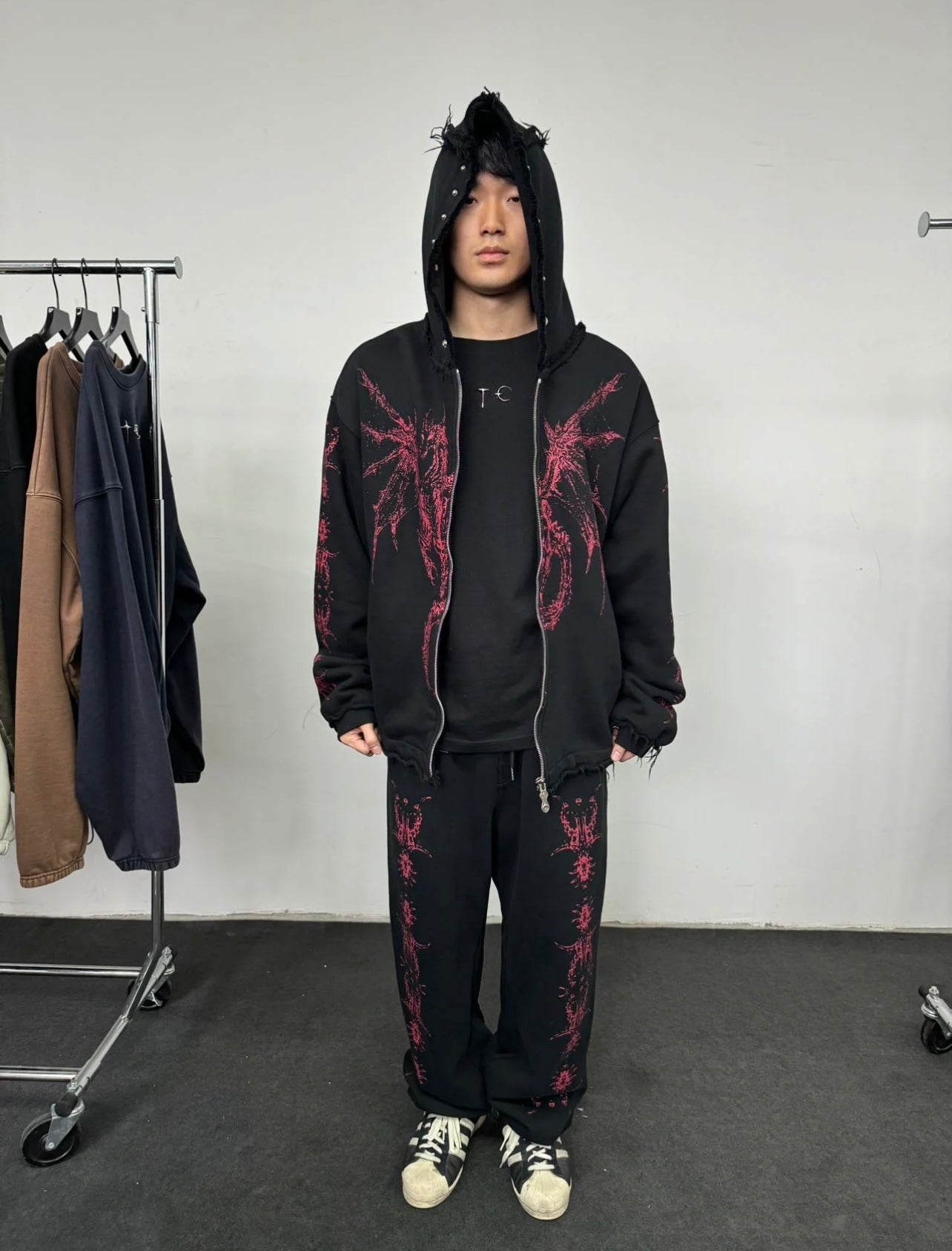 THUG CLUB Heavyweight Hoodie Dragon Spine Demon Print Studded Washed Zip-Up Jackets