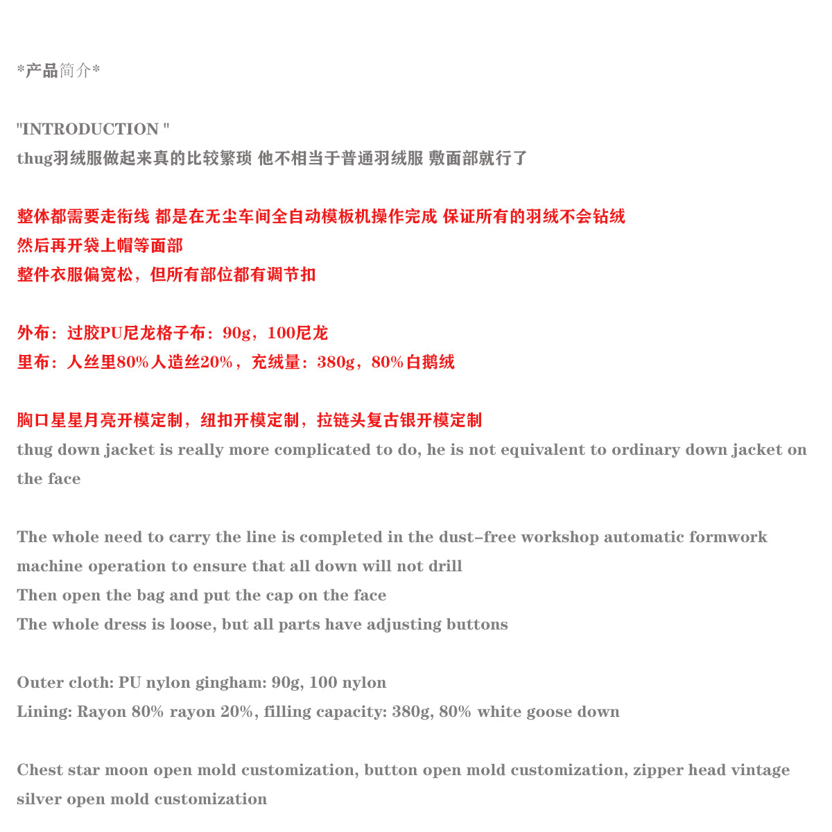 Experience ultimate warmth and protection with the ThugClub 23SS jacket. Made with waterproof and windproof nylon, this jacket is filled with 360g of premium goose down for maximum insulation. Stay comfortable and stylish, no matter the weather.